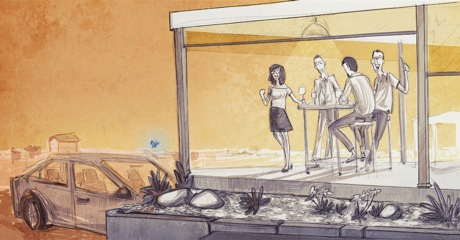 Noi quattro, sempre noi quattro, una serata estiva, come quando eravamo bambini, solo che non si gioca più a pallone, la voglia di spaccare il mondo è la stessa, di crederci, di vivere di leggerezza e aspettative, di ridere, di respirare la vita che ci avvolge, senza pensieri per il tempo dell’aperitivo.