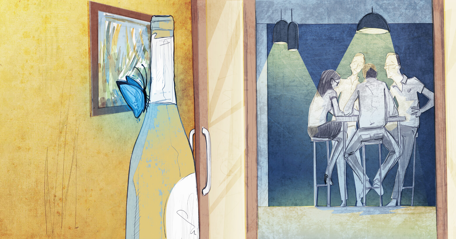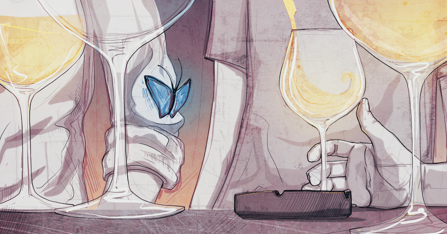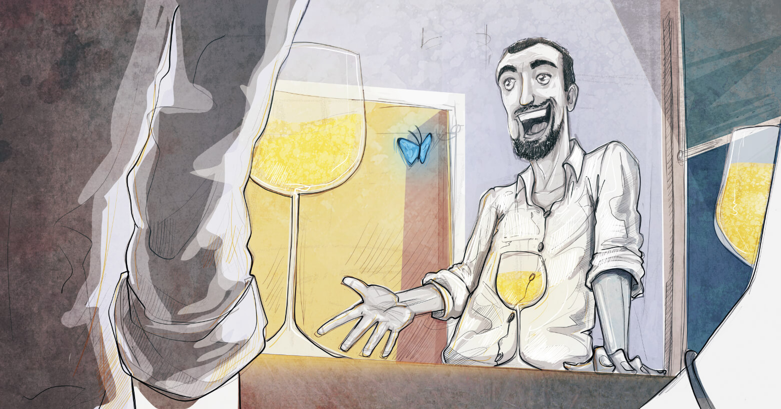 Silenzio….riflessione… un pensiero prende forma guardando il calice davanti a me, con quella leggera umidità che si crea nel bicchiere d’estate, sembrano le ali di una farfalla, la sfiori e svanisce, ma in un attimo torna, si ricrea, ricompare compatta come un’amicizia vera, come noi quattro… (con un aperitivo si può salvare il mondo…)